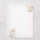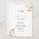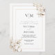 Framing the invitation, a border that is adorned with cascading bouquets of ethereal white and soft ivory blooms, artfully arranged in two corners like a gentle embrace. These luxurious florals, in their delicate neutral tones, exude an air of refined romance, setting the perfect tone for your most cherished day.