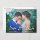 An elegant wedding save the date postcard designed to accommodate your favourite horizontal or landscape orientated full-bleed engagement photo. "Save the date" appears as a white text overlay in hand lettered calligraphy script. Personalise with your names, wedding date and wedding location beneath.