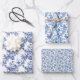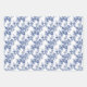 Timeless Toile Blue Wrapping Paper features three elegant sheets adorned with classic floral patterns in rich blue, perfect for vintage lovers.