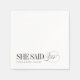 Elegant typography design with timeless serif font and classic calligraphy in black and white, simple and romantic. Great she said yes napkins for modern classic engagement party, and formal vintage bridal shower.