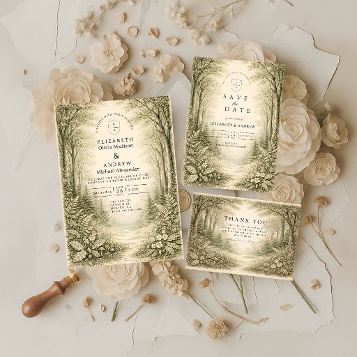 A charming woodland wedding design inspired by storybook forests and nature romance. Illustrated pine trees, woodland animals, birds, florals, and soft earthy tones create a warm, enchanting atmosphere that feels intimate and timeless. Perfect for forest weddings, outdoor ceremonies, mountain venues, or nature-loving couples. Text is fully customizable to reflect your special day.