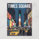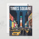 Detailed graphic illustration of Times Square at night, featuring bright billboards, tall buildings, and a street crowded with classic yellow New York taxi cabs.