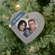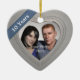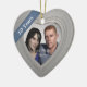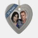 This heart-shaped ornament with a punched tin look print (not actually metallic) is perfect either for a 10th wedding anniversary (which is traditionally celebrated with tin) or any other occasion. Add your own photo to the heart frame and then on the back personalise it with a custom message. Although the text on the blue ribbon says '10 years' for those celebrating ten years of marriage, it can be changed to any other short text of your choice (such as 'I love you'). This design has a slight 3d look -- note that the ornament itself is a flat printed design and is not raised or textured.