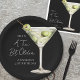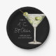 Tini Bit Older Birthday Paper Plate. This playful design features a muted green watercolor martini glass with olives on the right side, set against a bold black background. The phrase “A Tini Bit Older” appears at the top in crisp white handwritten script for a fun, cheeky vibe. The birthday person's name and age are displayed at the bottom left in a clean mix of white serif and script fonts. Perfect for any age, but especially a 21st birthday, these plates bring a stylish and festive touch to your party tableware.