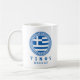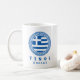 Tinos, Greece coffee mug featuring the national flag of Greece inside a Greek blue Aztec circle and the name of the island written in Greek style. This mug is perfect for you to enjoy drinking your coffee while you are on vacation on the beautiful Greek island of Tinos.