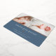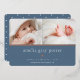 Sweet and elegant birth announcement features two newborn photos aligned side by side, with a band of rose gold foil beneath. Personalise with baby's name, birth stats, and a family message, adorned with a small rose gold foil heart on a dusty blue background.