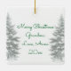 Personalised Christmas ornament. Cute little tiny festive home log cabin with a snowy forest background.