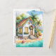 Personalised Christmas postcard. Cute little white festive tiny house on a beach with pretty festive Christmas decorations like wreaths, garland and Christmas lights on palm trees. On the back of the card you can add your own custom holiday message.