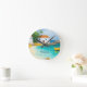 The clock did not take as long to arrive as I thought it might and was extremely well packaged. I didn't do the measurements so I didn't realize it is a little smaller than the average clock but that does not matter (just make sure you check if that's important to you).It is really nifty! It seems very solid and well made not flimsy at all. It has been going well and has kept good time in its few weeks on my wall. Nice product. Gets noticed too! Nicer in real life than the picture but true to the picture