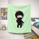 Cute cartoon ninja girl is dressed all in black but for a pink bow on top of her head mask. Traditional Japanese sword katana can be seen attached over her shoulder, it’s handle also coloured pink.