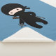 Cute cartoon ninja dressed in black is holding a throwing star. Traditional Japanese sword katana can be seen attached over his shoulder.