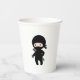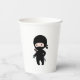 Cute cartoon ninja dressed in black is holding a throwing star. Traditional Japanese sword katana can be seen attached over his shoulder.