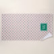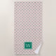 Preppy chic monogrammed beach towel in pale blush pink and green features an allover pattern of palm trees, with your single initial monogram centered at the bottom in vibrant emerald green.