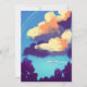Digital illustration depicts large, vivid orange clouds reflecting the rays of the setting sun. The sky is clear blue and you can see a small white plane. There are dark trees with pink flowers in the foreground