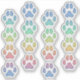 16 dog paw print stickers in rainbow hues to arrange into your own design.