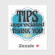 Tips appreciated sticker for the service industry. Customers sometimes do not know when it is appropriate to tip, and these stickers placed in your place of business will let them know that tipping is appreciated and remind them to tip. Perfect for any personal service business: waiters and food service, drivers, bartenders, hair stylists, contractors, home repair, manicurist, massage therapist, dog groomer, or tattoo artist. Promote tipping etiquette! Fun font on blue gradient background with 3 stars.