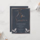 Stunning Christmas Party Invitation | Dark blue background with copper frame. Calligraphy text says "Tis the Season " in copper as well.. holly leaves and berries in shades of dusty blue edged in copper.