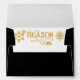 Tis the Season Christmas holiday design envelopes with snowflakes typography text of gold that reads Tis the Season to be Jolly Fa la la la la la la , also features a laurel wreath of gold, green, and white with a gold deer on the outside flap!