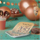 Get your Spooky on and dance! These party plates have 3 skeletons dancing the night away. They're holding jack o'lanterns and there are bats and tree leaves flying about. Text reads "Tis the Season To be SPOOKY" and the background is a watercolor ombre of orange, white and green.