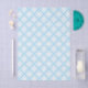 Diamonds in an interwoven lattice design. Three different sizes of squares turned on edge, are set to look like they are interlaced lattice. Largest diamond is the selected background colour (defaults to aqua blue). Smaller squares (one thin, one medium width) are woven at the corners of the large diamond/square. Smaller diamonds are medium and light shades of chosen background colour.