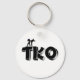 TKO written in Asian style font, black English writing. On the top of the technical knock out initials are the silhouettes of two MMA fighters are sparing, one wearing blue gloves & one red, which are the traditional MMA colours.