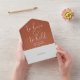 This all-in-one minimalist wedding invitation features elegant typography on a terracotta background. The invitation includes a perforated RSVP card that can be individually addressed or left blank so you can handwrite your guest's address details. Designed by Thisisnotme©
