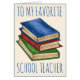 Greeting card features an original marker illustration of a stack of library books, with TO MY FAVORITE SCHOOL TEACHER in a fun font.