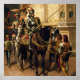 Mediaeval knights in shining armour are mounted on horses, holding lances and wearing plumed helmets. The setting appears to be a grand hall or courtyard adorned with intricate details and banners. This painting is “To the Joust” by Cesare Detti.