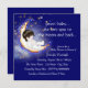 Sweet baby moon and stars we love you to the moon and back baby boy shower invitations. This elegant night time moon and stars baby boy shower invitation is easily customised for your event. You can add your event details in the font style and wording of your choice, as well as change the background colour to whatever you prefer.