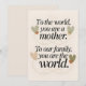 Express the immeasurable love and appreciation for a mother with this touching card. Featuring the beautiful sentiment, "To the world, you are a mother. To our family, you are the world," this design perfectly captures the vital role a mother plays. The elegant typography and soft design elements, including delicate hearts and dotted swirls, add a touch of warmth and tenderness. This card is ideal for Mother's Day, birthdays, or any occasion to celebrate a special mum and acknowledge the profound impact she has on her family. It's a meaningful way to show your mother how much she is loved and cherished.