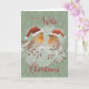Christmas card for wife has two little watercolor birds wearing Santa hats, perched on a snowy limb, with snow falling around them.