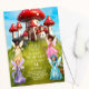 A fairy princess themed girls Birthday invitation template. The magical design features a vibrant red toadstool castle surrounded by rainbow colored fairy princesses with magic sparks. Personalize by editing the digital or printed invite with your unique event details.