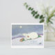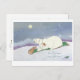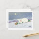 A polar bear is tobogganing on a snowy hill, with purple mountains in the background. You will also see both the sun and the moon. Around his neck the bear wears a Christmas necklace with a gingerbread man and a candy cane.