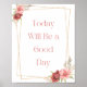 This poster has the inspirational message of, "Today will be a Good Day." This message is set on a white background with gold geometric shapes bordered by pink flowers, and greenery.