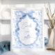 This item blends classic elegance with whimsical charm. The design features a delicate toile de Jouy pattern in soft baby blue, showcasing vintage-style safari animals like elephants, giraffes nestled among floral and leafy details. The intricate linework and gentle colour palette give it a timeless, heirloom feel—perfect for a refined and sweet celebration. Accented with elegant typography and frame with bow. This itemeffortlessly blends whimsy, tradition, and grace, offering a beautiful way to welcome a new baby. Matching items available.
