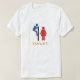 This t-shirt is called 'toilet humor' The white t-shirt shows a man peering over the walls of a toilet looking at a woman. The figures are in blue and red with 'toilet' written below the pictures. this funny design is perfect as a present or as an original and funky for yourself