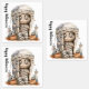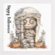 A wide-eyed mummy with a skeletal face sits inside a stone tomb, one hand pointing outward in playful defiance. Flanked by two carved jack-o’-lanterns and tiny skeleton companions, the scene is framed by gravestones, and scattered autumn leaves. The design blends spooky charm with cartoonish mischief, capturing Halloween spirit through bold character, eerie details, and a wink of the unexpected.
