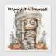 A wide-eyed mummy with a skeletal face sits inside a stone tomb, one hand pointing outward in playful defiance. Flanked by two carved jack-o’-lanterns and tiny skeleton companions, the scene is framed by gravestones, and scattered autumn leaves. The design blends spooky charm with cartoonish mischief, capturing Halloween spirit through bold character, eerie details, and a wink of the unexpected.