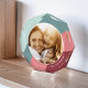 Add a favourite photo to this uniquely shaped geometric photo block to create memorable keepsake of a special year, event, vacation, or holiday. Design features a background of organic wavy stripes in shades of spruce green, rose pink, and cranberry.