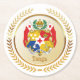 The coat of arms of Tonga is set in the middle of a faux gold circle which is in between 2 laurel branches which are also faux gold.