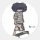 Hand drawn picture of a kid, with big bushy hair that covers his eyes, standing on a skateboard too cool to be bothered.