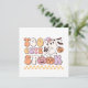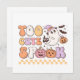 Cute, colourful, fun Halloween design featuring a ghost with a witch hat and pumpkin, several jack o lanterns, and text off lavender, yellow, pink, orange, and white that reads Too Cute to Spook!
