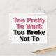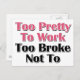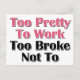 Funny Too Pretty To Work saying in hot pink text that shows a sassy girly attitude. This would make a hilarious gift for any college girl that is paying back student loans, a mum with a family to raise or any lovely lady that has expensive taste.