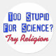 It's time to fight back against the religious fanatics who want to deny Science in favour of superstition. In blue letters "Too stupid for science?" answered in red letters "Try Religion."