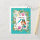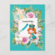 A cute and adorable illustration of a fairy princess wearing a faux teal gold crown and a pretty blue dress is beaming broadly and is holding floss wrapped around a shiny white tooth. A smiling toothbrush is flying above the tooth about to brush it and another blonde haired fairy appears at the top left holding a faux gold coin imprinted with a tooth. They are framed by boho dry leaves and pretty pink rose flowers. A template for your daughter; granddaughter; niece or godchild name appears on the front and the back has templates for your personalised wording. Don't forget to remove the ATTRIBUTION link by clicking it, to remove the Zazzle logo.