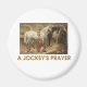 It's a Jockey's Prayer vintage design with jockey praying in the barn with his horses and dog, for safety, his loved ones, and a safe ride. Slogan apparel, magnets, and gifts.