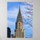 The top of New York City's iconic Chrysler Building against a blue sky with white clouds and bare tree branches