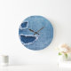Torn denim fabric texture, blue hues. large clock
