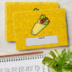 Cartoon illustration of tortilla sandwich wrap. Junk food outline icons yellow pattern background. Custom text.