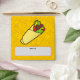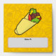 Cartoon illustration of tortilla sandwich wrap. Junk food outline icons yellow pattern background. Custom text.